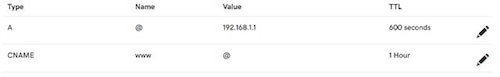 Here is a standard set up telling you that the “A record for your_company.com (also known as @) is on the server IP address of 192.168.1.1,” and the “CNAME of www is also pointing to the alias of @, which is 192.168.1.1.”