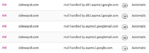 These records are just telling the sending email server, when sending an email to sideways8.com, deliver to aspmx.l.google.com (10). If that server doesn’t accept the email, then send it to alt1.aspmx.l.google.com (20), etc.